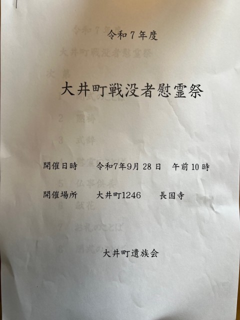 9月28日(日曜日)午前10時から長国寺にて『令和7年度 大井町戦没者慰霊祭』が執り行われました。先の対戦から80年が