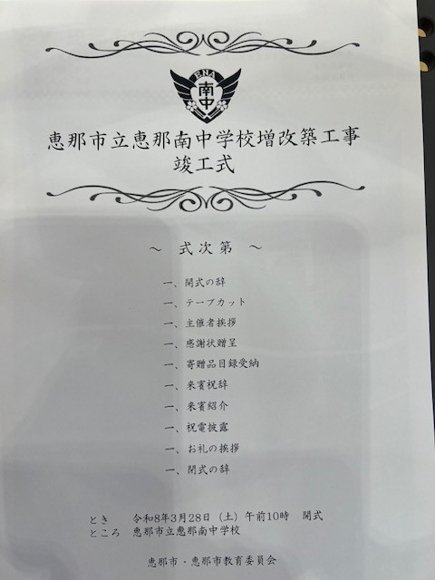 3月28日(土曜日)午前10時から恵那南中学校にて『恵那市立恵那南中学校増改築工事 竣工式』が開催されました。